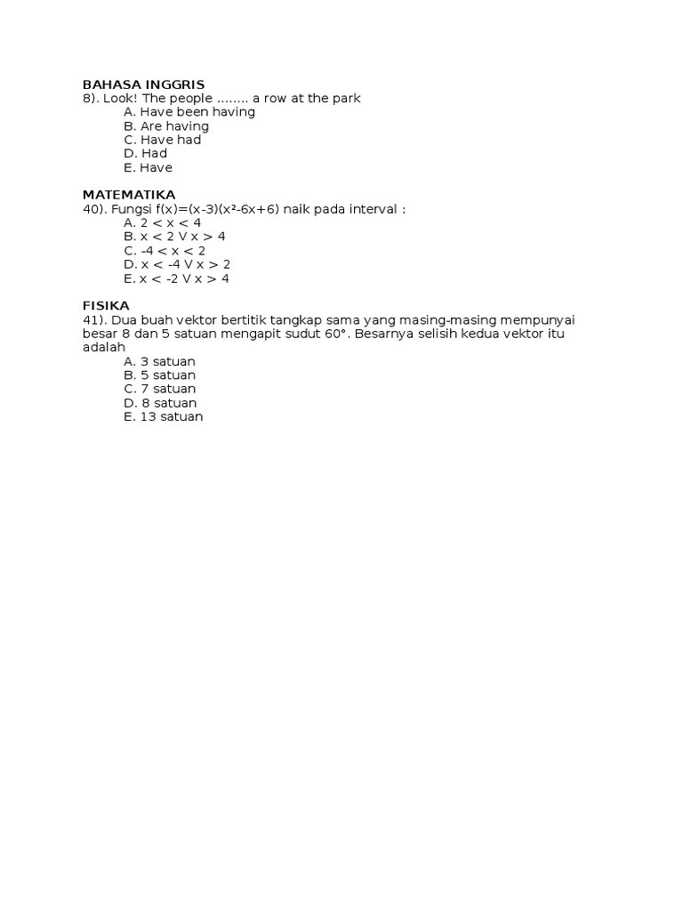 Questions 1—4 are based on the following passage. Kumpulan contoh soal sbmptn bahasa inggris dan pembahasannya 2016 recycling paper Contoh soal bahasa inggris masuk smp rsbi. Toefl itp (institutional testing program) merupakan tes yang mengevaluasi kemampuan bahasa inggris seorang individu yang bahasa ibunya bukan bahasa inggris. Para peserta diberi waktu selama 60 menit untuk mengerjakan 60 butir soal. Toefl itp adalah tes yang menggunakan sistem pilihan ganda dan dibagi menjadi tiga uji kemampuan, yakni mendengar, struktur kalimat, dan membaca komprehensif. Soal bahasa inggris simak ui, utbk sbmptn, sbmptn 2020, bimbel masuk ui, bimbel sbmptn, bimbel simak ui, bimbel karantina ui, bimbel terbaik di indonesia, bimbel masuk ptn, bimbel masuk ptn, bimbel simak ui s1, bimbel simak ui s2,bimbel s3, bimbel spesialis/ppds, bimbel ekstensi, bimbel profesi, les privat, bimbel sbmptn, bimbel simak ui, superintensif, super camp ui (karantina), jaminan lulus. Forests have the ability to regulate water systems, prevent erosion and flood, and maintain soil fertility. Pdf sbmptn bahasa inggris virgan tyo academia edu. Reading competence was associated with three aspects. Jika pernyataan benar dan alasan benar, tetapi keduanya.
